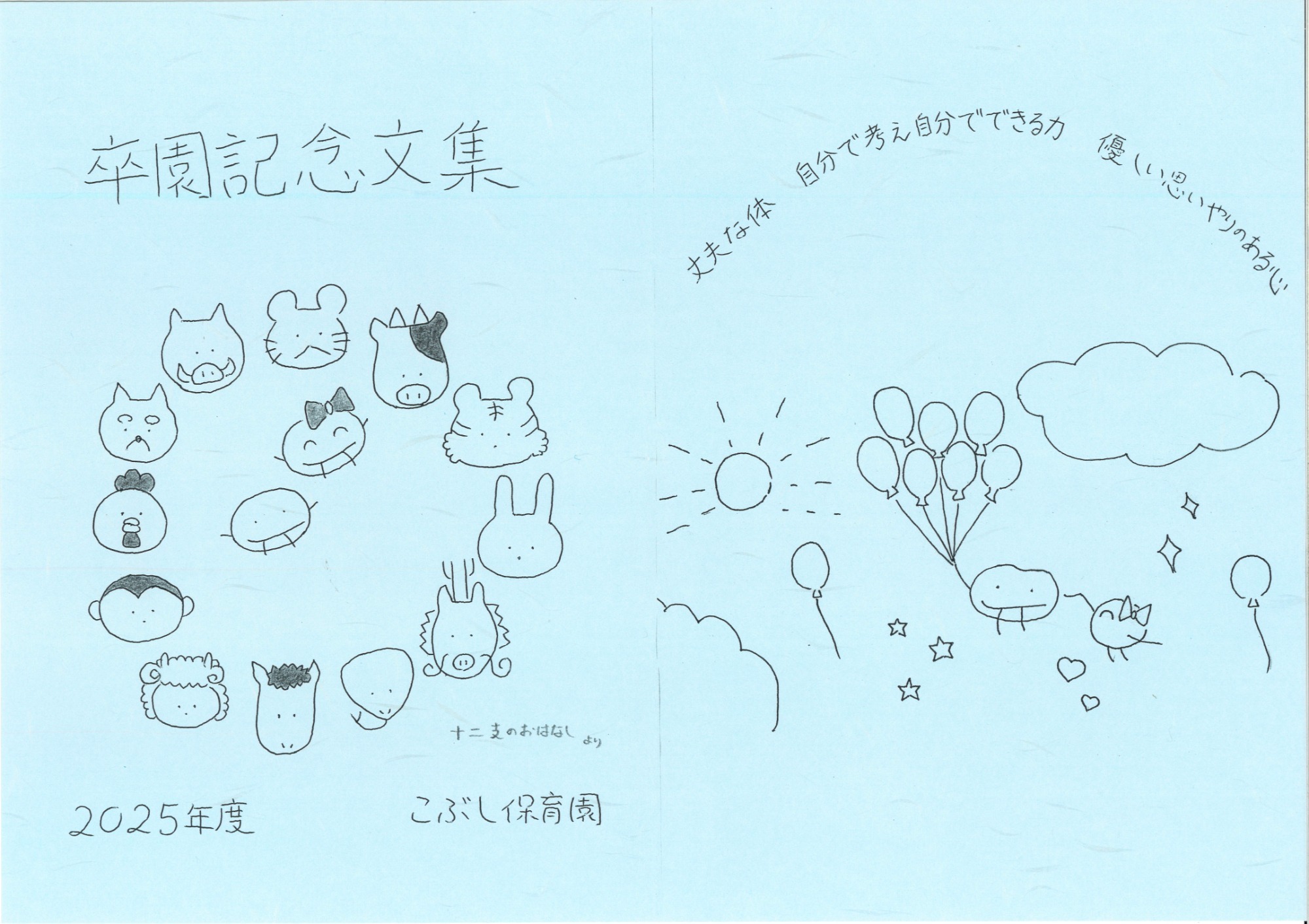 卒園生にお配りする卒園文集の表紙絵です(発表会の劇 十二支の話からとりました)。 園キャラクターこぶちゃんも みどり組のみなさんの門出を祝福しています。ご卒園おめでとうございます!!